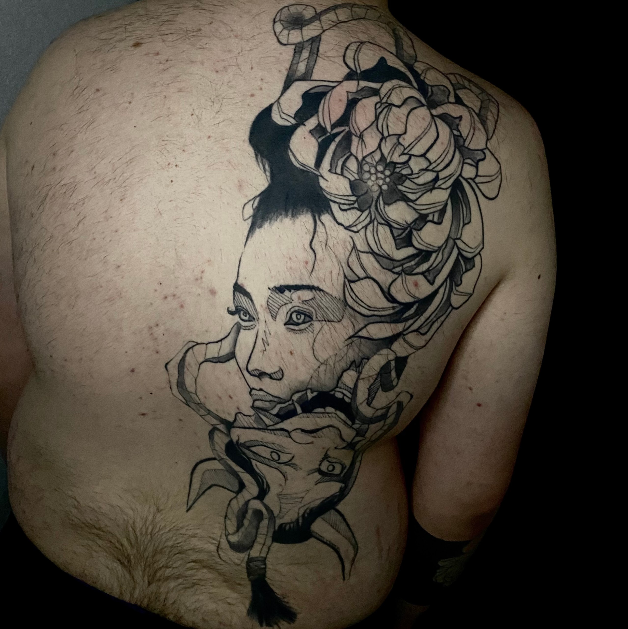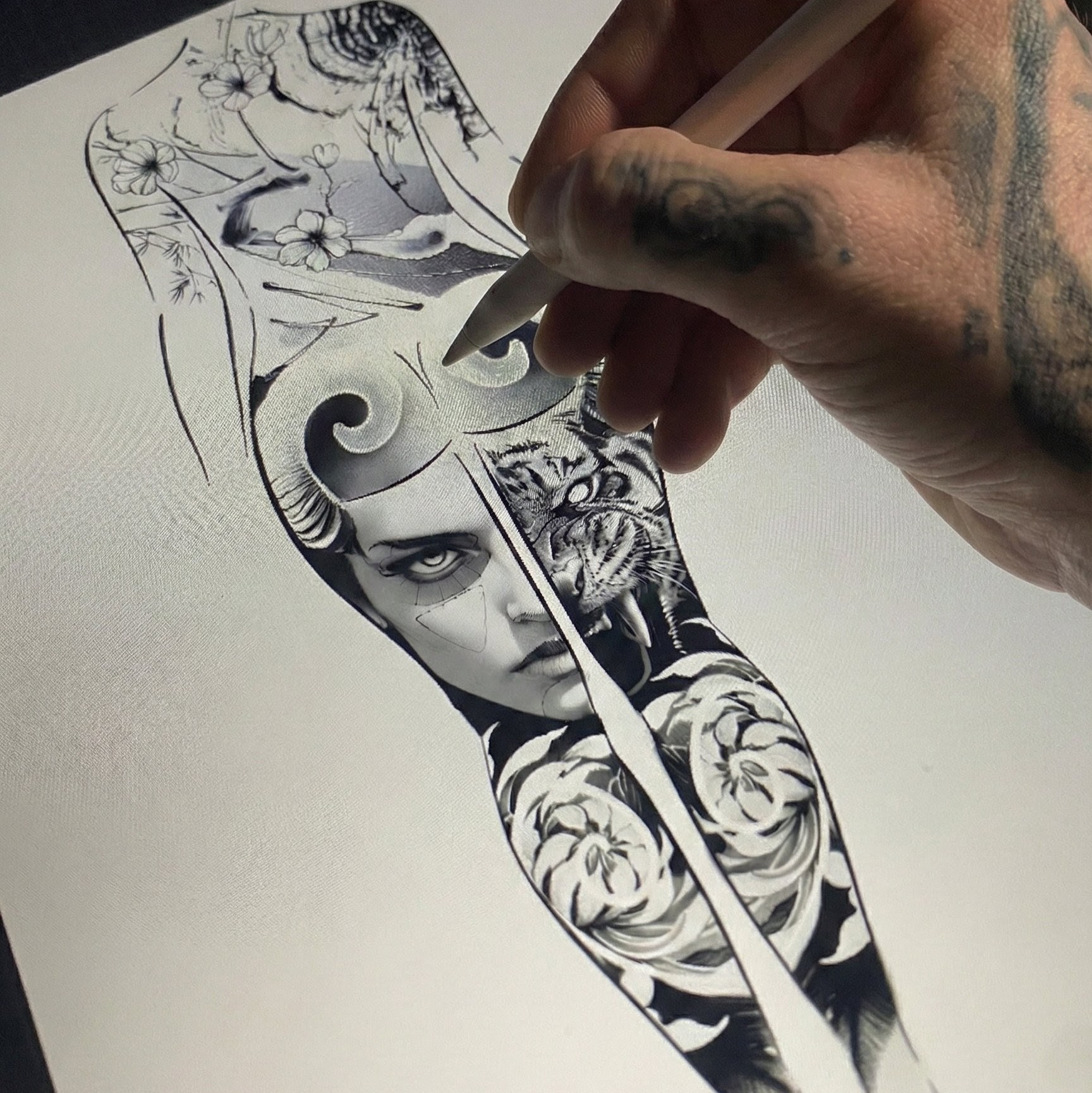 Je travaille le mouvement, les contrastes et léquilibre. Le motif ne doit pas être simplement posé sur la peau : il doit épouser les courbes du corps et vivre avec lui. C’est ici que l’imaginaire prend forme.