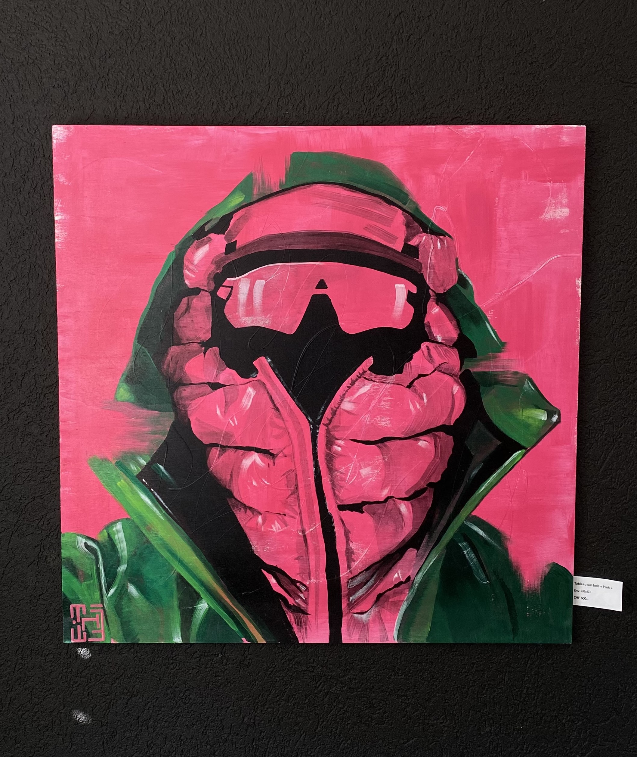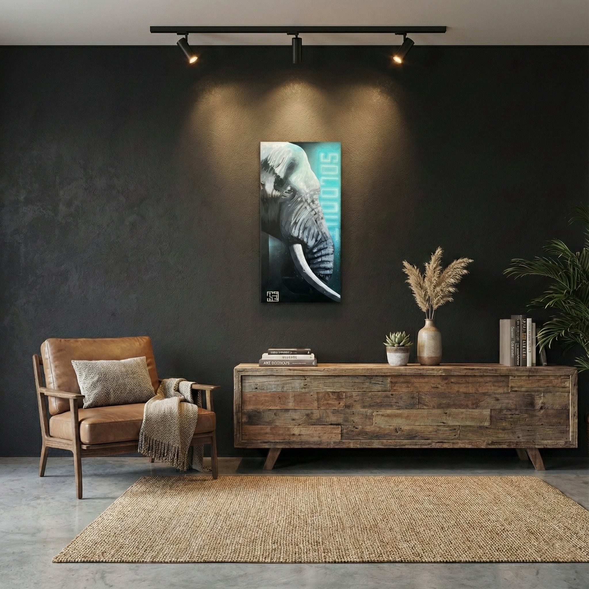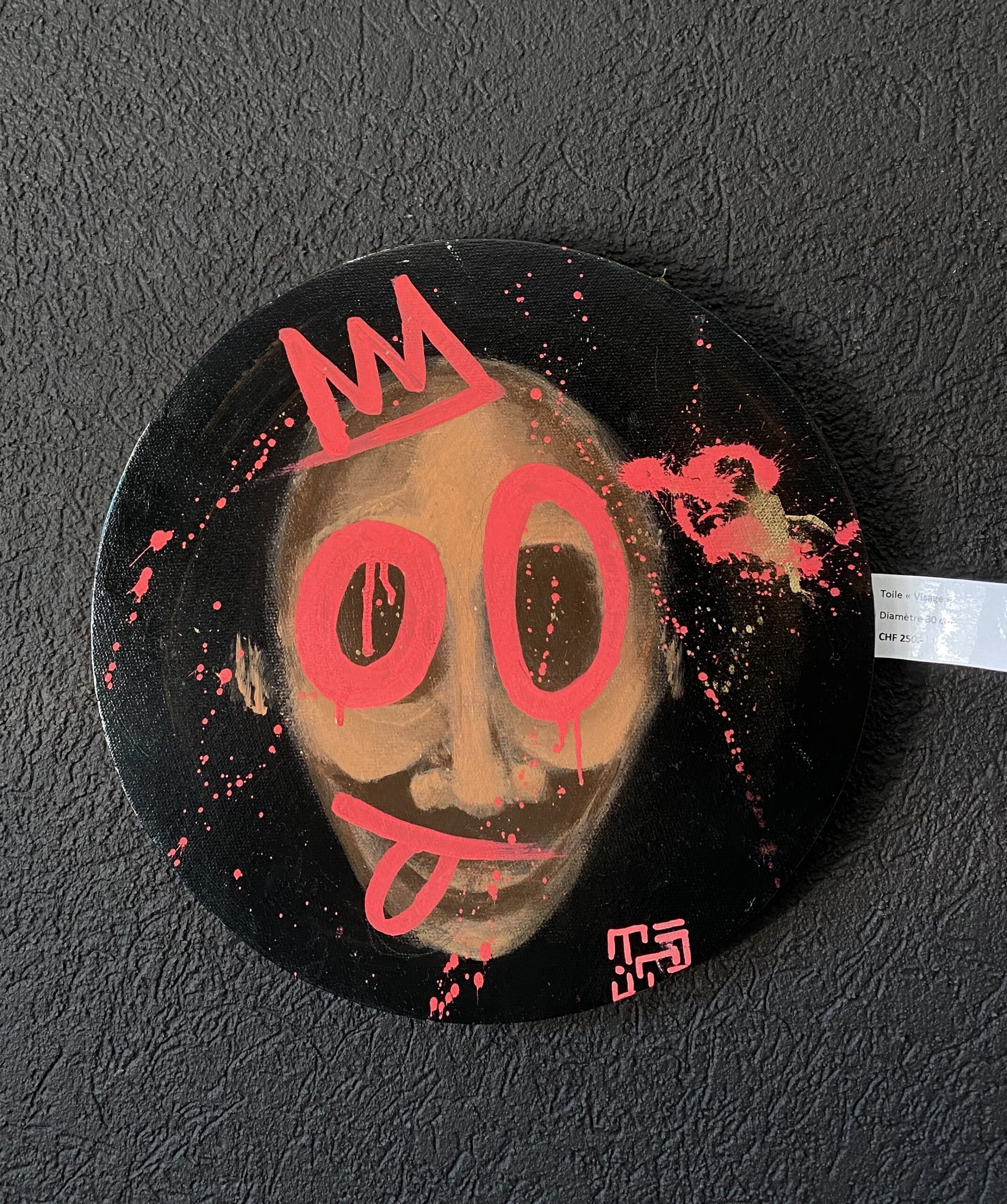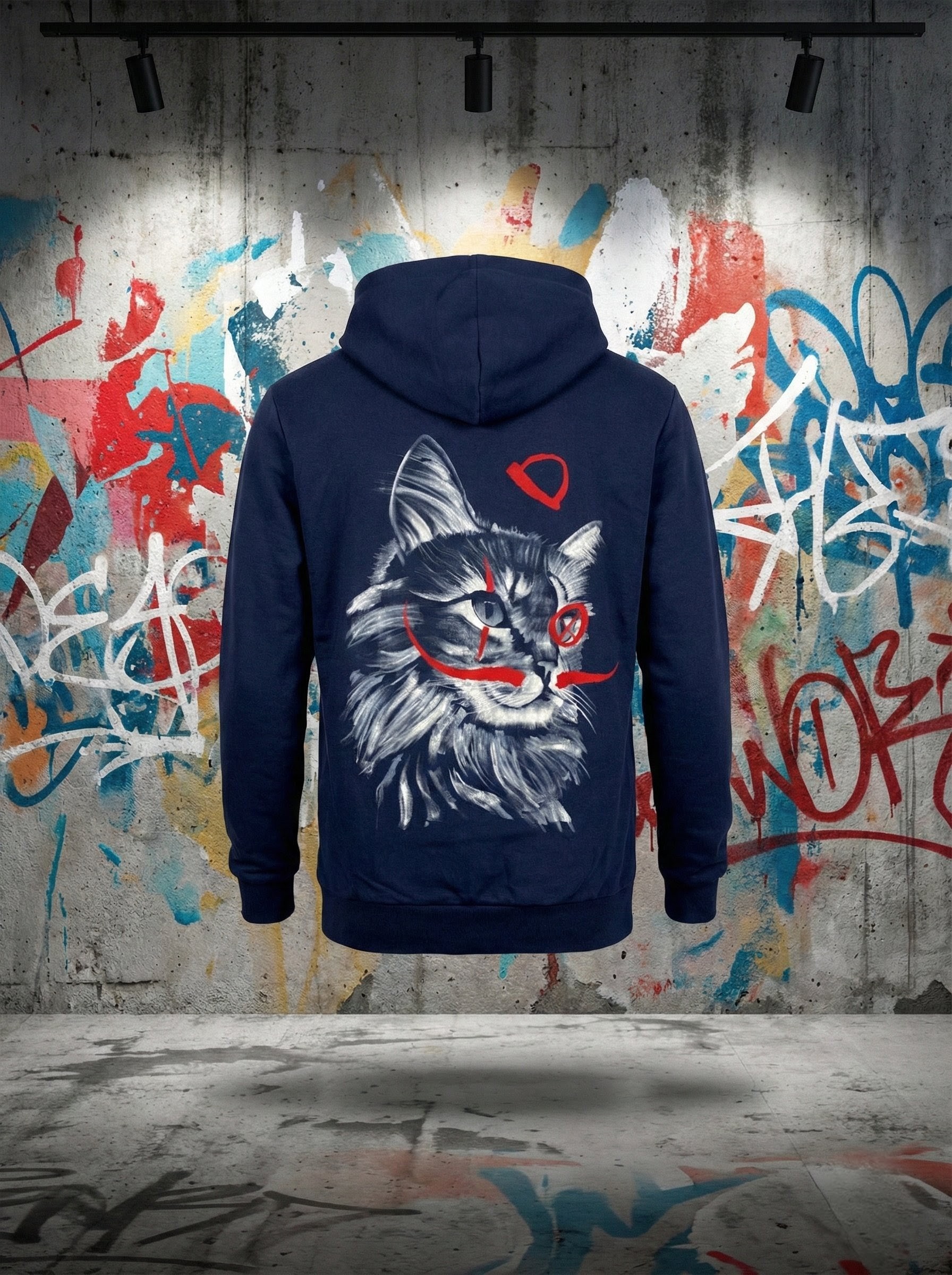 L’élégance féline rencontre la folie créatrice. Sur un fond bleu nuit profond, ce chat au réalisme saisissant semble poser pour la postérité, le regard fixe et le pelage détaillé. Mais l’art est un jeu: des traits rouge vif avec un effet velour, spontanés et graphique, viennent bousculer le sérieux du portrait. Un monocle esquissé, une moustache extravagante… C’est un clin d’oeil au surréalisme, une pièce unique où la majesté de l’animal se teinte d’une ironie mordante et sophistiquée.