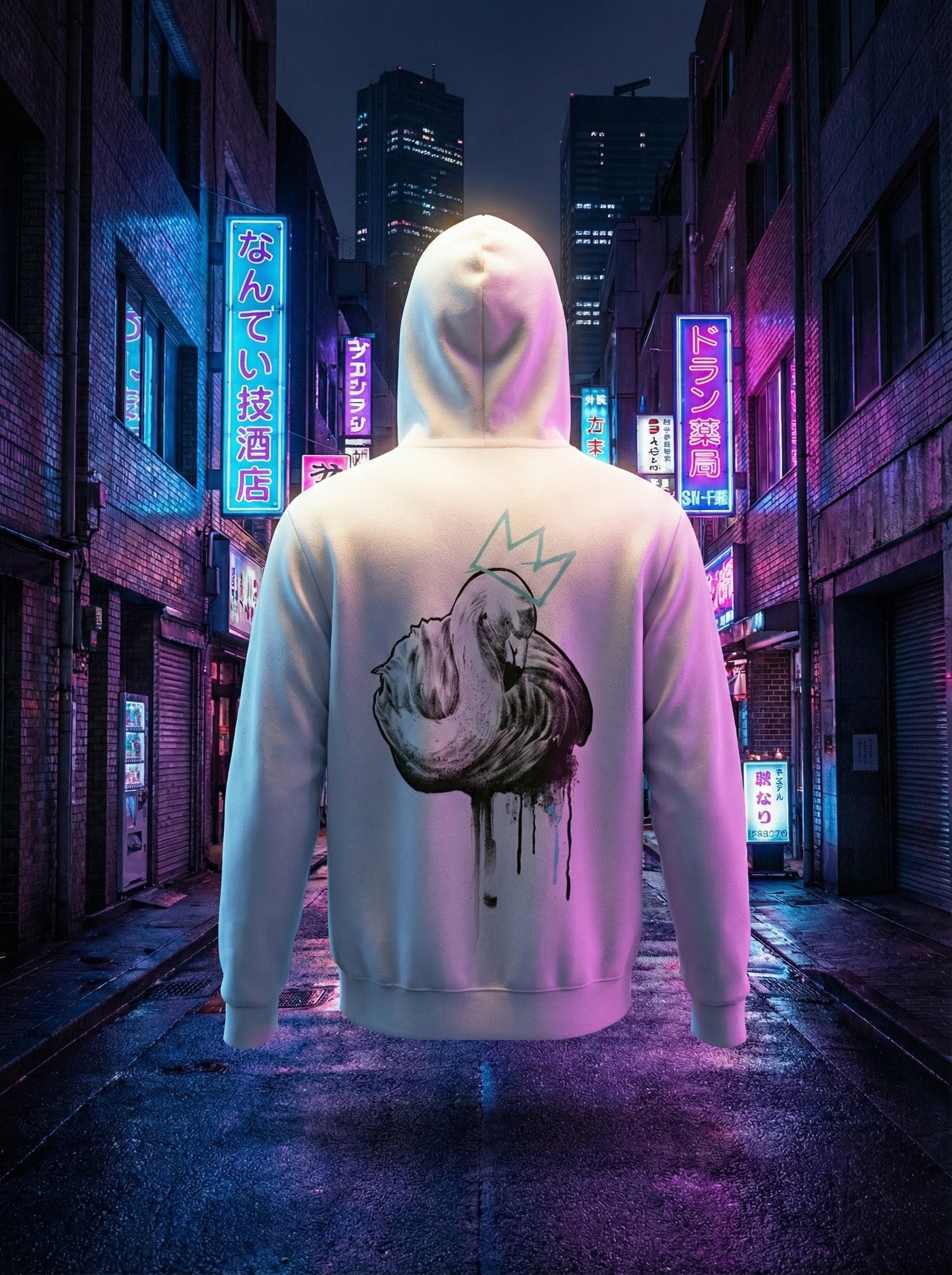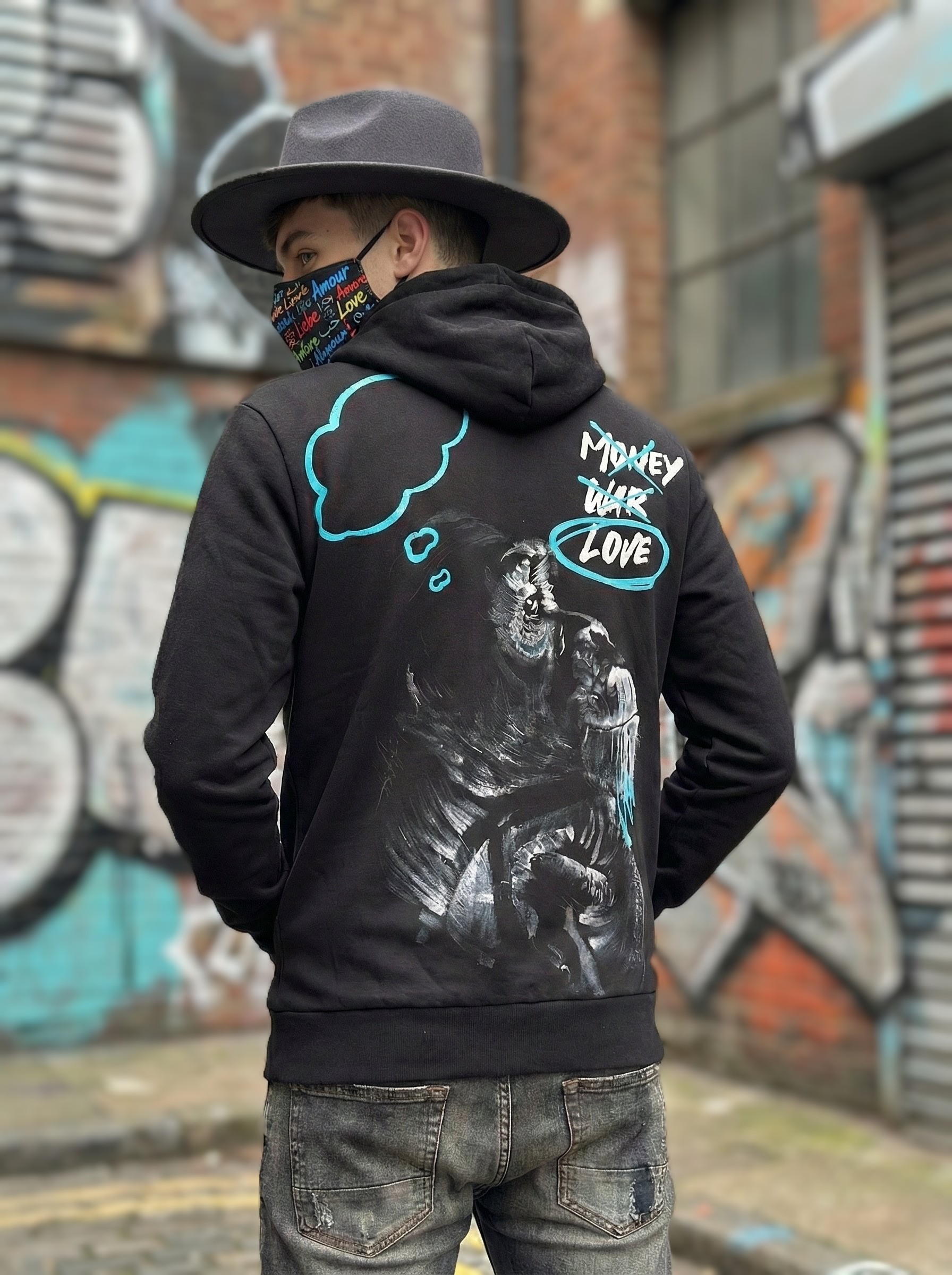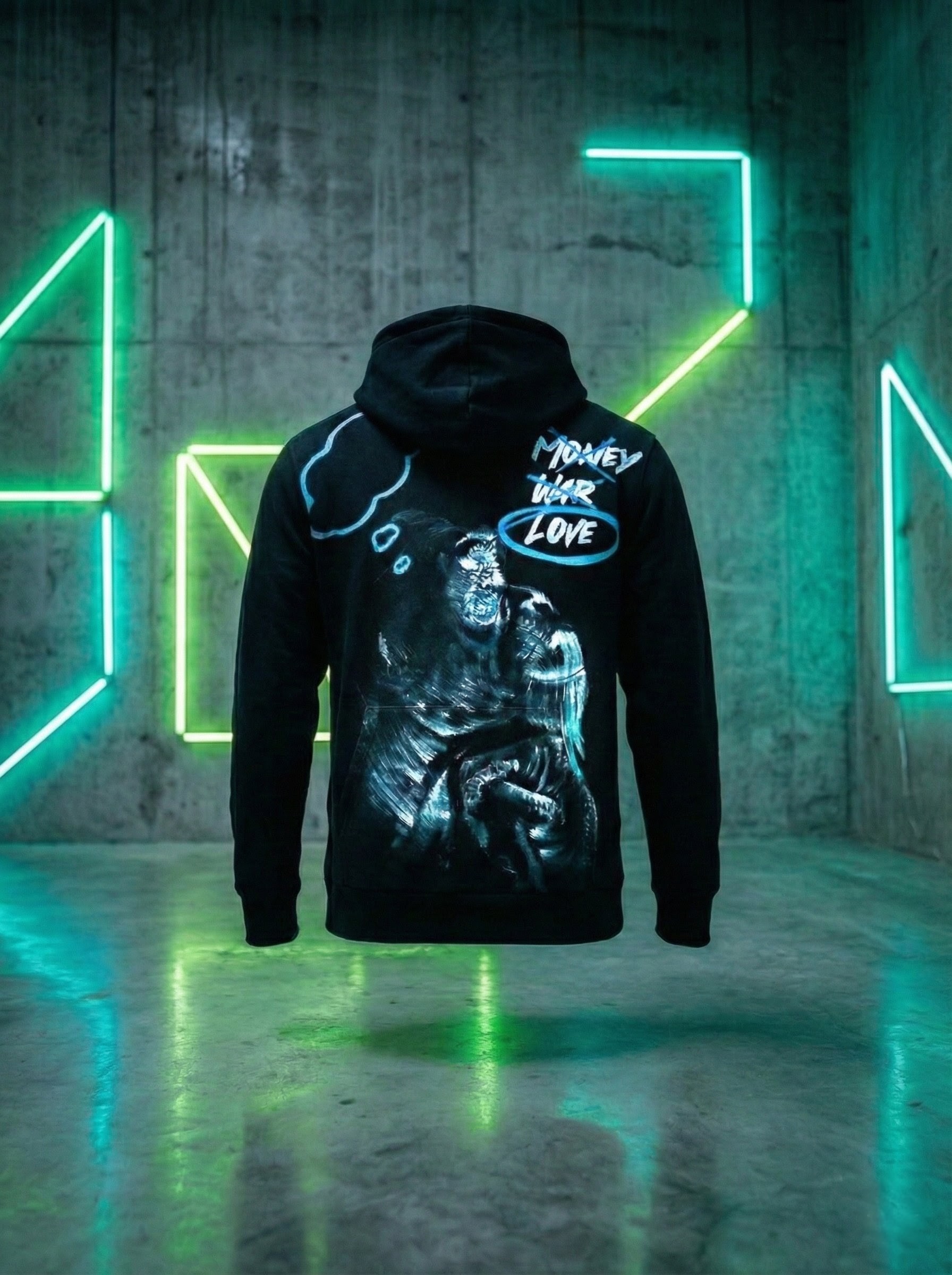 Au milieu du bruit, du profit et des conflits, le retour à l’éssentiel s’impose. Ce sweat-shirt unique met en scène un primate contemplatif, symbole de force brute et de sagesse silencieuse. Le message est tracé à même la matière: ni l’argent, ni la guerre, seul l’amour mérite notre attention. Une oeuvre portable, peinte à la main, où le réalisme sombre rencontre l’éclat du bleu cyan.